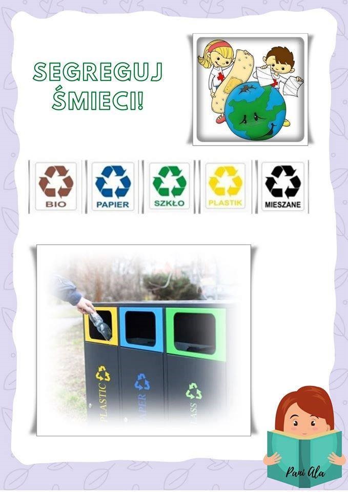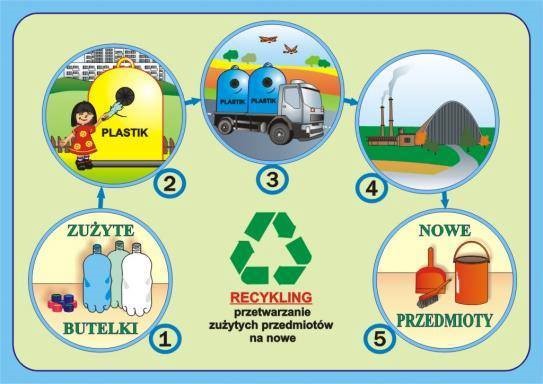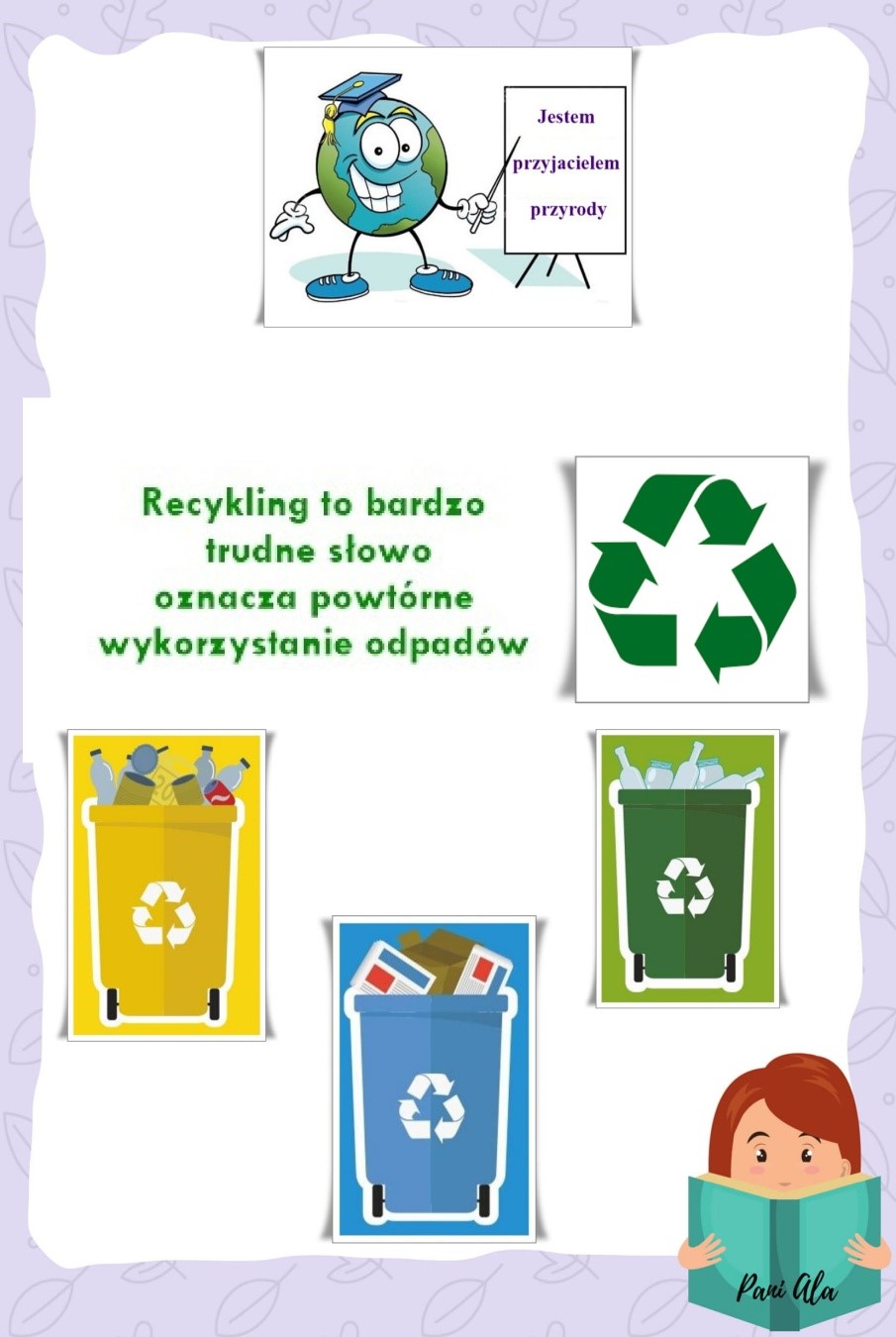 - Kochane przedszkolaki musimy o tym pamiętać jak ważne jest segregowanie odpadów do odpowiednich pojemników. Kiedy odpady są posegregowane, można z nich stworzyć nowe rzeczy. Ponowne wykorzystanie i przetworzenie odpadów nazywane jest właśnie RECYKLINGIEM. Czyli oznacza to, że wszystkie przedmioty na których znajduje się ten zielony znaczek zostaną ponownie wykorzystane do produkcji nowych (plik JPG pt. „Recykling”)