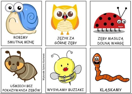 - Gimnastyka buzi i języka – spójrz na obrazki i spróbuj wykonać takie same minki jak poszczególne zwierzątka (plik JPG przesłany przez wychowawcę)
